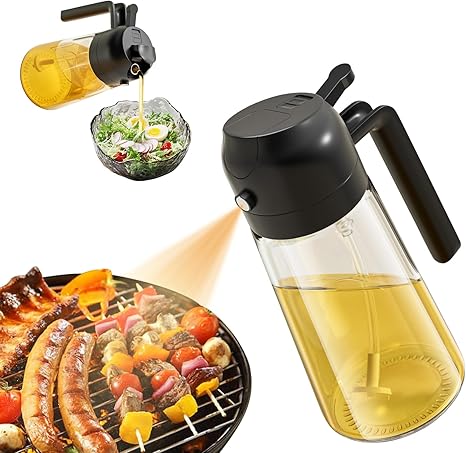 Elevate your cooking with the 2-in-1 Oil Dispenser and Sprayer, designed for versatile use in the kitchen. This premium 16 oz glass oil bottle allows you to easily dispense and spray olive oil or other cooking oils. Perfect for air frying, frying, salads, and BBQ, this food-grade oil mister ensures a fine mist for controlled flavor without excess. Its sleek black design adds a modern touch to your kitchen essentials.